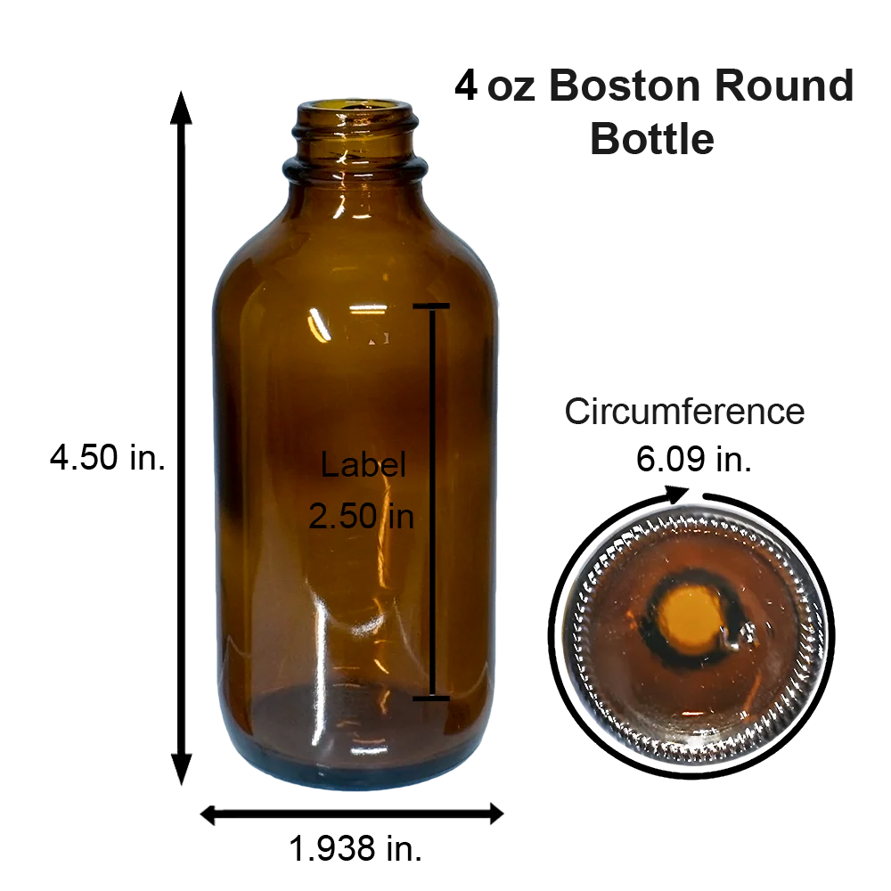 Whether you're looking to bottle your own herbal remedies, store your own distilled essential oils or create luxurious massage oils to use, share or sell, our 4 oz. amber Boston round glass bottle with black glass dropper is the perfect choice for glass packaging to meet your needs. The amber glass provides ample protection from the damaging effects of UV, and the convenient glass dropper top greatly simplifies dispensing the bottle's contents. Large enough to hold 4 ounces of liquid, this Boston round glass bottle seals tightly to reduce the risk of spillage, yet the grooved texture of the grip ensures ease of opening.